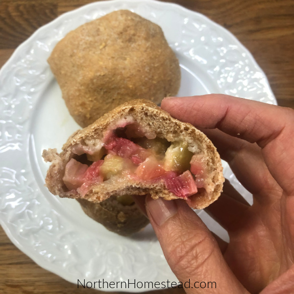 One of our favorite Pirozhki fillings is apples and rhubarb. It’s a bit like apple-rhubarb pie, except you can hold it in one hand and pack it easily for a picnic.